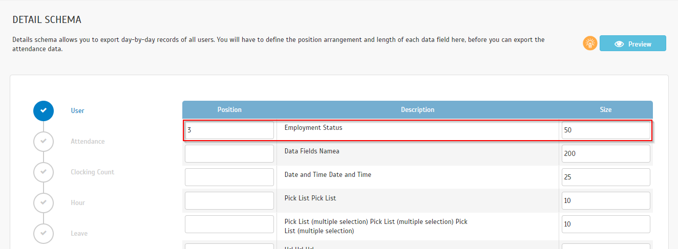 | To export the attendance data, Admin needs to first configure the Detail or Summary Schema (Attendance > Export Attendance > Detail/Summary Schema) by specifying the required column arrangements for the export file. This May, we’ve added two data fields to the selection available in Detail Schema, as shown below. a. Added 'Employment Status' under User Section |